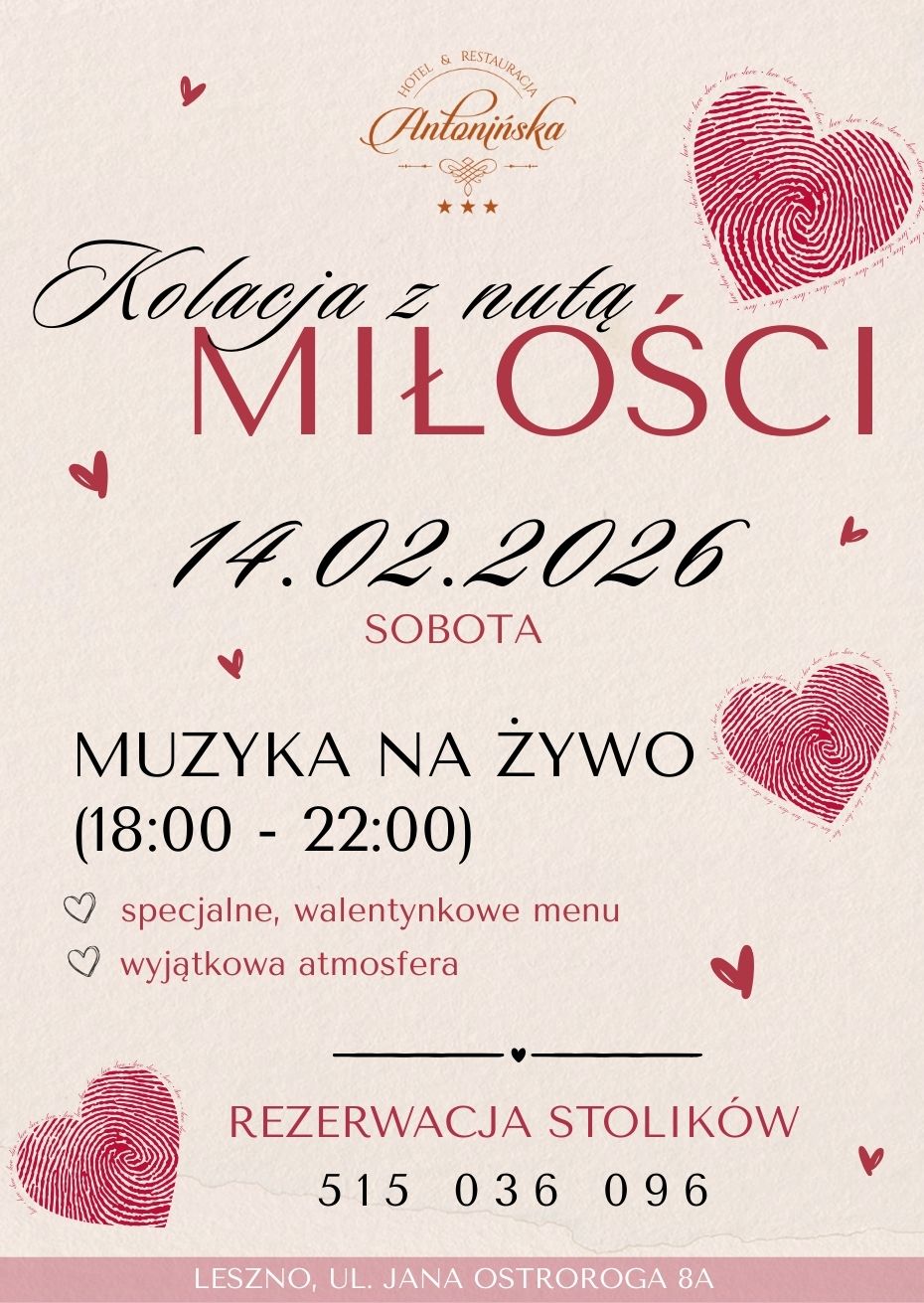 14 lutego restauracja Antonińska w Lesznie zaprasza na romantyczną kolację z muzyką na żywo.